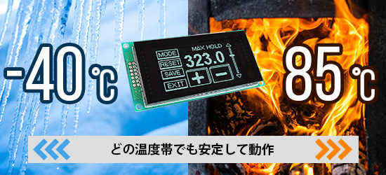液晶パネルは構造上、温度の影響を大きく受け、 視認性が低下することがあります。一方でVFDは温度の影響をほとんど受けない堅牢な真空管構造で、 低温~高温どの温度範囲でも安定して見やすく表示します。VFDは耐環境性が求められる産業機器において大きな信頼と実績を得ています。